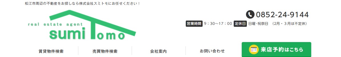 松江市学園に位置する株式会社スミトモは、地域密着で不動産事業を展開しています。共有持分など、権利関係が複雑な不動産についても、お客様の状況を考慮し、丁寧な相談・買取に対応しています。