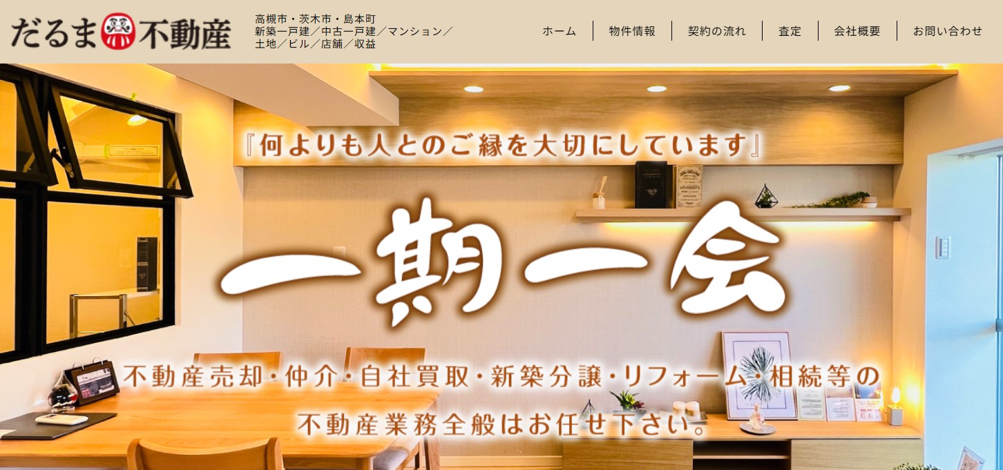 高槻市昭和台町の株式会社だるま不動産は、知る人ぞ知る、高利回りを生み出す「訳あり」の価値を見出す不動産のスペシャリストです。高槻市・茨木市・島本町を中心に展開しており、売却に高度な専門知識が必要な再建築不可の不動産や土地についても、お客様の悩みに寄り添いながら、資産価値を最大化させるための迅速かつ丁寧な不動産売買・仲介・自社買取・新築分譲・リフォーム・相続物件をサポートしております。