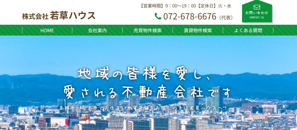 高槻・茨木・摂津市を拠点に、広域で事業を展開する株式会社若草ハウスは、負動産を富動産へと転換させるための確かな提案力を備えた不動産会社です。他社で断られ続けた土地や、活用方法に独自の工夫が求められる再建築不可の不動産や土地についても、プロフェッショナルな視点からお客様の状況に合わせた不動産の売買・賃貸・仲介・管理・建築・設計・施工をサポートしております。